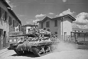 The armoured regiments were organized along British lines although with fewer tanks than their British counterparts. A New Zealand armoured regiment consisted of 52 Sherman tanks. These composed a Regimental HQ troop of four tanks and three Squadrons of sixteen tanks.[8] In addition the regiment contained a Recce Troop equipped with Stuart V light tanks in both turreted and turret less configurations and an Intercommunication troop equipped with Lynx light scout cars. Each Squadron consisted of a Squadron Headquarters with four tanks and four troops each of three tanks.[8]