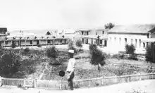 In 1796,[nb 2] The Don Fernando de Taos Land Grant gave land to 63 Spanish families in the Taos valley,[6][2] including the Taos Plaza which was then called Don Fernando de Taos.[3][nb 1] The settlement was built as a fortified plaza,[3] with strong gates to enclose the settlement to protect the residents and livestock at threats of attack by Plains Indians. At each corner of the thick adobe walls of the plaza sentries stood guard for protection. Within the plaza, residents celebrated during fiestas, engaged in church festivities, and traded goods.[2] It is now a central plaza surrounded by residential areas.[3]