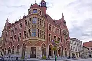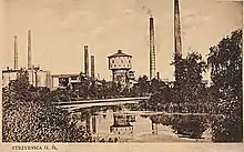 At the onset of World War II in September 1939, Poland was invaded by Germany and Nazi German occupation began. On September 6–8, 1939, the Einsatzgruppe II entered the town to commit various crimes against Poles.[13] Mass searches of Polish organizations, offices and houses,[14] and mass arrests of priests, teachers, intelligentsia and fighters of three anti-German, Silesian Uprisings (1919–1921) took place. The synagogue was burned while German minority enthusiastically welcomed invading Nazi forces. Already in September 1939, the Germans murdered over 20 Poles in the present-day districts of Lasowice, Strzybnica and Repty Śląskie.[15] Among the victims were miners, former insurgents and a school principal from nearby Chorzów.[15] Germany established and operated a prison for Poles in the town.[16] During the occupation, the Armia Krajowa (Home Army, the leading Polish underground resistance organization) undertook a sabotage campaign against Nazi forces, railroad-transport and local industry. The Germans operated two forced labour subcamps of the Stalag VIII-B/344 prisoner-of-war camp in the town.[17] Liberation of Silesia came in early 1945; in order to save the industrial infrastructure of the region, the Red Army opened an offensive supported by massive numbers of troops with minimal use of heavy artillery and air-bombardment. According to witnesses, the entire operation was extremely fast; countless, shoulder-to-shoulder, crowds of Russian soldiers passed through the town in matter of minutes followed by almost complete still.