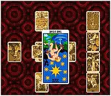 Each reading consists of a Celtic cross where 12 cards are picked by the person being read. These cards will tell about the player's past, present, and future via on-screen text. The game automatically reads the person's fortune. Once the cards are dealt, each card deals with different issues in the player's future. They are: current situation, issues, awareness, subconscious, past problems, future, present position, environment, hope, and result.[4]
