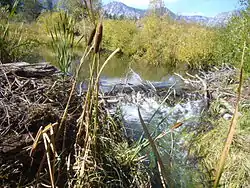 All of the beaver dams in Taylor Creek, which flows from Fallen Leaf Lake to Lake Tahoe, are destroyed annually each fall by the U. S. Forest Service in order for Kokanee salmon (Oncorhynchus nerka) to spawn. A recent study of Taylor Creek showed that the beaver dam removal decreased wetland habitat, increased stream flow, and increased total phosphorus pollutants entering Lake Tahoe - all factors which negatively impact the clarity of the lake's water.[10] In addition, beaver dams located in Ward Creek, located on the west shore of Lake Tahoe, were also shown to decrease nutrients and sediments traveling downstream.[10] Recently novel physical evidence has demonstrated that beaver were native to the Sierra until at least the mid-nineteenth century, via radiocarbon dating of buried beaver dam wood uncovered by deep channel incision in the Feather River watershed.[11] That report was supported by a summary of indirect evidence of beaver including reliable observer accounts of beaver in multiple watersheds from the northern to the southern Sierra Nevada, including its eastern slope.[12] Deep water created by beaver dams may provide critical refugia from winter ice for native cutthroat trout (Oncorhynchus clarki).[13][14] Importantly a 2013 study showed that cutthroat trout move easily across beaver dams in both directions.[15]