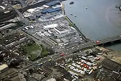 One unusual feature of the site was the railway line that ran through the car park; this linked the British Rail sidings at Northam to Driver's Wharf where scrap metal was loaded into ships. It was operated by a venerable 0-4-0 diesel shunter. In 1984, the line fell into disuse as the scrap was now delivered by road.[5] The tracks were then tarmacked over to provide extra car parking spaces. The line featured in the first episode of Saturday Banana with a steam locomotive, Bonnie Prince Charlie, from the Great Western Society at Didcot.