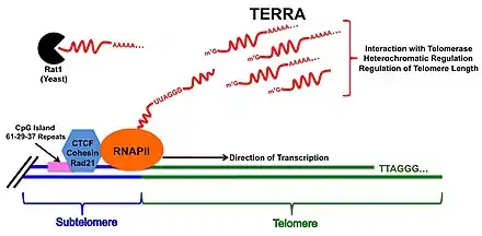 While the exact transcription start site is still a matter of debate, it is widely held that TERRA transcription begins in the subtelomeric region at the end of chromosomes, just before the tandem repeats of the telomere begin. In humans, at least 20 of 23 chromosome ends have been shown to contain CpG islands, which are generally found at or near transcription start sites in the subtelomeric region. Within these CpG island are three repetitive DNA tracts occurring in sequence: a centromere-proximal tract of repeated 61-base-pair (bp) units; second, a more distal tract of 29-bp units; and a third 37-bp unit tract. These highly conserved repetitive elements are known as 61-29-37 Repeats. Additionally, the chromatin organization factors CTCF (CCCTC-Binding Factor), Cohesin, and Rad21 - which are known to aid in the recruitment of RNAPII[8] - have also been shown to bind within 1-2 kilobases of the telomeric tracks just upstream of these CpG islands.[9] While not definitely known, the proximity of these factors immediately upstream of the proposed TERRA transcription start site suggest that they may function as promoter elements for the start of TERRA transcription.[6]