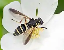 Temnostoma barberi (Curran, 1939), the Bare-bellied Falsehorn, is a fairly common species of syrphid fly observed in the eastern half of the United States and adjacent areas of Canada. Hoverflies can remain nearly motionless in flight. The adults are also known as flower flies for they are commonly found on flowers, from which they get both energy-giving nectar and protein-rich pollen. Temnostoma adults are strong wasp mimics. The larvae burrow in moist decayed wood.[3][4]