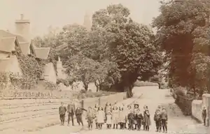 The parish church of St. Andrew was entirely rebuilt in 1875 to a design by Frederick Preedy[8] on the site of an older edifice.[2] Consisting of a chancel with a north organ chamber and vestry, nave, north aisle, and a south-west tower serving as a porch, it is built of lias stone with sandstone dressings, and has tiled roofs. On the north wall of the chancel is a repainted stone shield of arms of the 17th century with the six quarterings of the Woodchurch-Clarke family, impaling the quarterly coat of De la Hay, Winterbourne, Sheldon, and Ruding. In the organ chamber is a 17th-century oak chest with panelled sides, a carved top-rail, and a panelled lid.