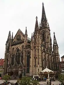 Until 1858, the former parish church of St. Stephen stood at the location of the current building. The originally late Romanesque building from the 12th century was expanded at the beginning of the 14th century in the Gothic style. A substantially higher choir was added to the nave. In 1510, the Romanesque bell tower was remodelled in the style of the Renaissance. In 1707, the bell tower was crowned with an onion dome. In 1857, the city council of Mulhouse decided to replace the place of worship, which had come to be looked upon as dilapidated, by a new building. The city architect Schacre, who had already constructed the main synagogue of the city and the Catholic St. Stephen's Church, designed a church in the neo-Gothic style with a simple, rectangular ground plan without a transept and choir. In contrast to the long Catholic church, it was a squat, but very wide building. The bell tower, which is visible from quite a distance away, stands behind the building, in contrast to its model on the Freiburg Minster. The current church was built between 1859 and 1866. Since February 2009 and prospectively until late 2019, the church is subjected to a progressive restoration of all its exterior and interior parts. The work had started with the complete scaffolding of the steeple.[2]