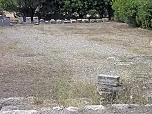 There is another terrace in front of the temple, extending 8.25 metres to the east.[32] The central area, directly in front of the temple was paved with Hymettan marble slabs.[33][32] About ten metres east of the temple, in this paved area, there was a large altar,[35] measuring 5.62 metres from east to west and 8.30 metres from north to south. The eastern part is the podium where animals were sacrificed; the western part is a stair case, 2.12 metres long and 7.00 metres wide.[36] It was probably the same height as the stylobate of the temple.[36] A set of orthostates with stone shields carved in relief may have run around the edge of the altar. There was an inscription on a band above them (Ag. I 6634), but it is too fragmentary to read.[37] They were subsequently reused as underpinning for the pavement.[37] A drain running north from the Odeon of Agrippa crosses this area and diverts around the altar[16][17] A base was erected at the southwest corner of the altar.[37] Another was located to the southeast.[38] A marble block with an iron ring on the top, used as a hitching post for sacrifices was located to the north of the altar, but it was probably related to some earlier structure.[39][34]