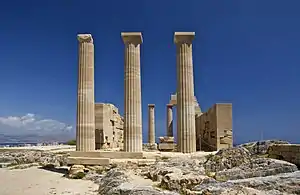 According to legend, the temple was founded by Danaus and the Danaïdes. According to Pseudo-Apollodorus (2 cd-Century BC), the temple was founded by Danaus, who dedicated a statue to Athena Lindia in his gratitude for her assistance in helping him construct a ship, by which he could help his daughters to escape: "Danaus, in fear of the sons of Aigyptos, under Athena's supervision built a ship (the first man to do so), put his daughters [the 50 Danaïdes] on board and escaped. Putting in at Rhodes, he dedicated the statue of Athena Lindia. From there he went to Argos."[2] Strabo described the temple as founded by the Danaides rather than their father: "In Lindos there is a famous temple of Athena Lindia, founded by the daughters of Danaüs."[3] According to Callimachus, the cult image of Athena put in place by Danaus was originally a xoanon before it was replaced by a statue, which indicates that the temple was of considerable antiquity.[4][5]