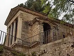 The source of the river Clitunno in Campello sul Clitunno at the foot of mountains, 1.5 km distant from the "temple of Clitumnus" was famous in antiquity as a site sacred to the river god Clitumnus. Pliny notes[1] that there, next to the river, "an ancient and venerable temple rises where Jupiter Clitumnus himself stands clad in a toga." Reporting how "the oracular responses delivered there prove that the deity dwells therein and tells the future," Pliny adds that the larger temple is accompanied by a number of smaller ones all around, each containing the statue of a god, one of which may have been at the site of the "Temple of Clitumnus".