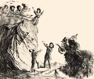 At the time, the United Principalities had a "Red" cabinet headed by Constantin A. Crețulescu, who was able to caucus among the Moldavian autonomists. One of the latter, Alecu D. Holban, canvassed for additional support at Iași. Boldur-Lățescu intervened to announce that Moldavians were being "cheated" out of their remaining local rights, but found himself heckled.[69] During summer 1867, Boldur-Lățescu experimented with satirical writing, putting out the short-lived humorous paper, Boldul ("The Pin"). This made use of provocative cartoons and lithographs, such as depicting the aurochs of Moldavia and a female figure representing the principality, both being pecked by crows; to these were added drawings which personally attacked Carol. They earned Boldur-Lățescu negative attention from Wallachian and monarchist soldiers stationed in Iași.[70] Moldova, meanwhile, entered a polemic with the Wallachian leftist C. A. Rosetti and his Românul gazette. In June, Moldova claimed that Rosetti had pocketed 20,000 ducats from funds meant to ensure Cuza's toppling. Românul responded that the claim was pure libel, and that the 1866 conspirators had only ever had 5,000 ducats between them.[71] It then returned with allegations of its own, namely that Moldova was a front for Rosnovanu's interests.[63]