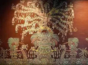 In many murals, the Great Goddess is shown with many of the scurrying arachnids in the background, on her clothing, or hanging from her arms. She is often seen with shields decorated with spider webs, further suggesting her relationship with warfare. The Great Goddess is often shown in paradisial settings, giving gifts.[17] For example, the mural from Tepantitla shows water dripping from her hands while in the tableau under her portrait mortals swim, play ball, and dance (see photo to right). This seeming gentleness is in contrast to later similar Aztec deities such as Cihuacoatl, who frequently has a warlike aspect.[18] This contrast, according to Esther Pasztory, an archaeologist who has long studied Teotihuacan, extends beyond the goddesses in question to the core of the Teotihuacan and Aztec cultures themselves: "Although I cannot prove this precisely, I sense that the Aztec goal was military glory and staving off the collapse of the universe, whereas the Teotihuacan aim seems to have been the creation of paradise on earth."[19]