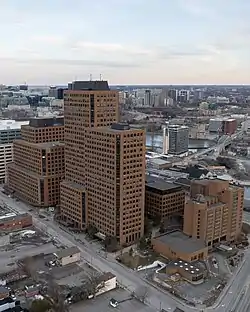 Today its three towers hold some 6,500 federal government office workers. The complex houses the headquarters of Crown-Indigenous Relations and Northern Affairs Canada (North Building),[1] the headquarters of the Department of Canadian Heritage (Jules Léger Building (South)),[2] the headquarters of the Canadian Transportation Agency (Jules Léger Building (South)),[3] the headquarters of the Canadian Radio-television and Telecommunications Commission (CRTC)(Central Building),[4] and other government entities.[5][6][7] The centre also holds a shopping complex, a hotel, and a convention centre.