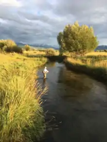 Flyfisherman on private water in restored section of Fox Creek, Teton River tributary in Autumn, 2017