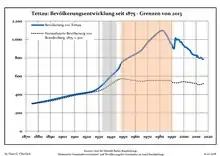 Development of Population since 1875 within the Current Boundaries (Blue Line: Population; Dotted Line: Comparison to Population Development of Brandenburg state; Grey Background: Time of Nazi rule; Red Background: Time of Communist rule)