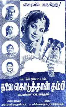 Thalai Koduthaan Thambi (transl. Younger brother gave his head) is 1959 Tamil-language historical action film , directed and produced by T. R. Sundaram of Modern Theatres,[1] and written by Murasoli Maran. Music was by Viswanathan–Ramamoorthy. It stars S. S. Rajendran, R. S. Manohar and Malini.