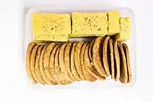The typical ingredients are rice flour, urad daal, peanuts, fried gram, chana daal and other seasoning which are mixed in their respective proportions and deep fried in oil. It is available in various flavors like Butter, Ginger and Masala.[1] Salem in Tamil Nadu is known for its 'Thattuvadai sets' which is made using the Thattai (like a bread in a sandwich) and stuffed with various vegetables like Beetroot, Carrot, Chutney and oils.