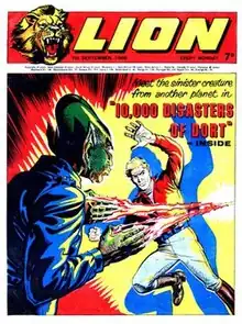 "The 10,000 Disasters of Dort" is a British comic strip published in the weekly anthology Lion from 18 May to 23 November 23 1968, published by Fleetway Publications. Written by Mike Butterworth and drawn by Spanish artists Luis Bermejo and José Ortiz, it concerns a terror campaign against Earth by aliens from the fictional doomed planet Dort, who hope to force humanity into sharing their home.