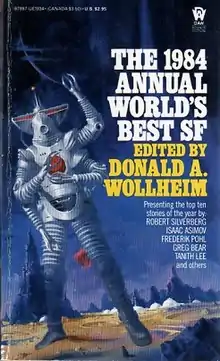 The 1984 Annual World's Best SF is an anthology of science fiction short stories edited by Donald A. Wollheim and Arthur W. Saha, the thirteenth volume in a series of nineteen. It was first published in paperback by DAW Books in June 1984, followed by a hardcover edition issued in August of the same year by the same publisher as a selection of the Science Fiction Book Club. For the hardcover edition the original cover art by Vincent Di Fate was replaced by a new cover painting by Richard Powers.