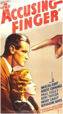 The Accusing Finger is a 1936 American drama film directed by James P. Hogan and written by Madeleine Ruthven, Brian Marlow, John Bright and Robert Tasker. The film stars Paul Kelly, Marsha Hunt, Kent Taylor, Robert Cummings, Harry Carey, Bernadene Hayes and Joe Sawyer. The film was released on October 23, 1936, by Paramount Pictures.[1][2]