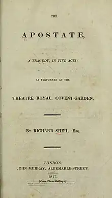 The Apostate is an 1817 tragedy by the Irish writer Richard Lalor Sheil.[1] It premiered at the Theatre Royal, Covent Garden on 3 May 1817.[2] The original cast included William Macready as Pescara, Charles Kemble as Hemeya, Charles Mayne Young as Malec, Thomas Comer as Hamy, Charles Murray as Alvarez, Daniel Egerton as Gomez and Elizabeth O'Neill as Florinda. The prologue was spoken by Charles Connor. It was loosely inspired by a 17th century work by the Spanish playwright Pedro Calderón de la Barca. The play was a success, but reviewers generally attributed this to O'Neill's acting rather than Sheil's writing.[3]