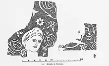 Some 24 centuries old, the mosaic known as The Beauty of Durrës has a surface area of about nine square metres. It is elliptical in shape, some 5.1 metres (17 ft) across at the widest and some 3 metres (9.8 ft) at the narrowest. The mosaic is made of unworked coloured pebbles and is still in fairly good condition.[6] The formal expression represents a good example of the art of antiquity, in which Hellenistic art is combined with the local motifs of Illyrian art. It is considered one of the world's most expressive mosaics of its genre.[7] From a stylistical point of view, the mosaic resembles mosaics of the same period discovered in Pella, once part of Ancient Macedonia.[2][6]