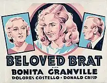 The Beloved Brat is a 1938 American comedy-drama film directed by Arthur Lubin and starring Bonita Granville, Dolores Costello, and Donald Crisp.[1] The screenplay was written by Lawrence Kimble from an original story by Jean Negulesco.
