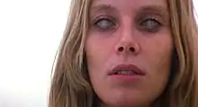 The white contact lenses worn by several actors in the film were made of glass and hand-painted with multiple shades of white enamel.[26] They were described by both MacColl and Warbeck as being very uncomfortable; MacColl recalled that after completing the film's finale sequence, both she and Warbeck had difficulty removing them from their eyes.[20] The lenses also obscured the wearer's vision, rendering them completely or nearly-completely blind.[22] Monreale expressed that wearing the lenses was extremely difficult for her; all of her scenes except one required her to wear them, and she had to rely on the film's makeup artist, Maurizio Trani, for assistance navigating the sets.[22] To minimize discomfort, Trani would regularly remove the lenses from the actors' eyes and disinfect them between takes.[26]