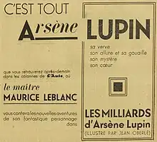 The Billions of Arsène Lupin is a detective novel by Maurice Leblanc about gentleman thief Arsène Lupin. The novel appeared in 29 daily serials, illustrated by Jean Oberle in Auto from 10 January to 11 February 1939,[1] then published in volume 16 in Hachette (Collection "The Enigma" No. 13) in November 1941, with illustrations by André Pécoud.