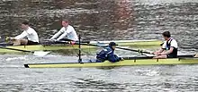 Oxford finished with a time of 18 minutes 6 seconds.[31] Rankov did not initially announce the result, instead he "spread his arms wide and shrugged his shoulders".[35] The result was confirmed to Rankov by finishing judge Ben Kent, with the winning margin being approximately 0.05 seconds,[36] and announced to the crews by Rankov under Chiswick Bridge: "One foot to Oxford".[37] James Livingston wrote of himself at the finish: "eyes widen and bulge in horror. Our desolation is total."[38]