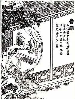 "The Bookworm" is a "fictional extension" of a poem titled Quanxueshi (Chinese: 劝学诗; lit. 'Poem exhorting studying') and written by Emperor Zhenzong, which highlights the importance of being well-read and learned. Parts of the poem are cited in "The Bookworm", most notably "There (in books), girls as beautiful as jade abound."[lower-alpha 1][1] Originally titled "Shuchi" (书痴) by Pu Songling, the full story was translated into English by Sidney L. Sondergard as "The Bookworm" in 2014.[2]