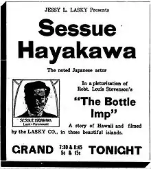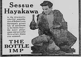 The Bottle Imp is a 1917 silent fantasy film produced by Jesse Lasky and distributed through Paramount Pictures. It is taken from the Robert Louis Stevenson short story, "The Bottle Imp". The movie was directed by Marshall Neilan in Hawaii and stars Japanese actor Sessue Hayakawa.[1][2]