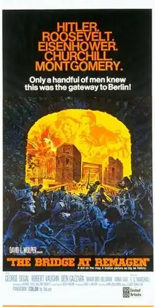 The Bridge at Remagen is a 1969 DeLuxe Color war film in Panavision starring George Segal, Ben Gazzara, and Robert Vaughn. The film, which was directed by John Guillermin,[3] was shot in Czechoslovakia. It is based on the nonfiction book The Bridge at Remagen: The Amazing Story of March 7, 1945 by writer and U.S. Representative Ken Hechler.[4] The screenplay was adapted by Richard Yates and William Roberts.[3]