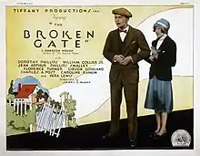 The Broken Gate is a lost[1][2] 1927 American silent drama film directed by James C. McKay and starring Dorothy Phillips, William Collier Jr. and Jean Arthur. It was produced and distributed by Tiffany Pictures.[3][4]