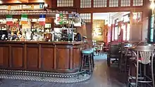 The saloon and public bar of the pub were joined together in 2005.[22] Whilst parts of the 1930s fielded wood panelling have been unsympathetically painted, the pub retains its fireplaces, bar-back (extending to the ceiling), bar and counter with round corner, and a rare example of a black and white chequered gutter ('spittoon trough') in the saloon. The Commercial continues to be a fine London example of an improved[23] inter-war pub (rebuilt by breweries to increase size and appeal more to families and particularly women), of which increasingly few remain.[24] The pub front is faience (now painted), which is also typical of the period.[4] A blocked external doorway between the two sides of the pub may indicate a former off sales.[2]
