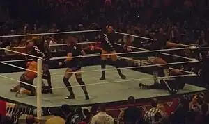 After Wade Barrett was kicked out of The Nexus by new leader CM Punk,[3] he moved from Raw to SmackDown.[4] While under CM Punk, Heath Slater and Justin Gabriel refused to perform their initiation to stay in the group and left The Nexus.[5] On the January 14 episode of SmackDown, Gabriel and Slater interfered during Barrett's match with Big Show, attacking Show. They were joined by Ezekiel Jackson who continued the attack by performing a body slam on Big Show.[6] Big Show continued to feud with the group throughout its existence and on the January 21 episode of SmackDown, the group named themselves The Corre, while also announcing that The Corre would be leaderless as all the members were equals.[7][8] They all competed in the Royal Rumble on January 30, but were all eliminated by different wrestlers (in order: Gabriel by Daniel Bryan, Slater by John Cena, Jackson by Kane, and Barrett by Randy Orton) with Jackson eliminating Big Show and Barrett eliminating Rey Mysterio and Diesel, and making it to the final four.[9]