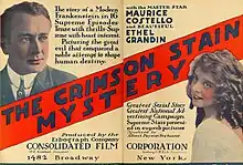 The Crimson Stain Mystery is a 1916 American horror film serial directed by T. Hayes Hunter.[1] 11 reels were found in the Dawson Film Find in 1978.[2]