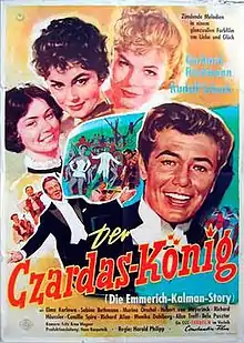 The Csardas King (German: Der Czardas-König) is a 1958 West German musical film directed by Harald Philipp and starring Gerhard Riedmann, Rudolf Schock and Elma Karlowa.[1] It is a biopic of the life of the Hungarian operetta composer Emmerich Kalman.