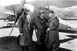 The scene in which Scott takes off with Courtney clinging to the wing switches to a shot of a Travel Air 4U Speedwing fitted with a round cowl over its Comet engine to resemble the Nieuports. Stunt pilots included Leo Nomis, Rupert Symes Macalister, Frank Tomick and Roy Wilson.[10] Several Thomas-Morse S-4 aircraft were used in the 1930 film. The S-4 was an American built fighter aircraft that did not see combat in World War I. Plentiful in 1930, the S-4s were becoming rare by the time the 1938 film was produced, hence the re-use of aircraft sequences from the original film. Some in-flight scenes with principal actors were staged with aircraft hoisted up by wires to a height of 25 feet. Stage hands then rocked the aircraft to simulate flight, but when one of the wires snapped, on screen, Barthelmess appeared startled, unaware that an accident had occurred, and simply thought the swaying aircraft was part of the scene.[11]