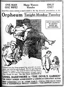 The Devil's Garden is a lost[1] 1920 American silent drama film produced by Whitman Bennett, directed by Kenneth Webb, and released through First National Exhibitor's Circuit, which was later known as First National Pictures. The film starred Lionel Barrymore, May McAvoy, and Barrymore's first wife Doris Rankin. It is based on the 1913 novel, The Devil's Garden by William Babington Maxwell, and was the first film for Whitman Bennett Productions.[2][3]