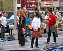 Hathaway prepared for the part by volunteering for a week as an assistant at an auction house where she was "put through the wringer" according to Weisberger, who adds that Hathaway supplemented that by asking her many questions about working for Wintour.[28] Frankel recalls that she was nervous through most of the shooting, particularly when working late, since Raffaello Follieri, her boyfriend at that time, preferred strongly that she not do so;[8] she was also having health issues due to a cyst.[2] The director said she was "terrified" before starting her first scene with Streep, who had begun her working relationship with Hathaway by saying first "I think you're perfect for the role and I'm so happy we're going to be working on this together" then warning her that was the last nice thing she would say.[47] Streep applied this philosophy to everyone else on set as well, keeping her distance from the cast and crew members unless it was necessary to discuss something with them.[37][34]