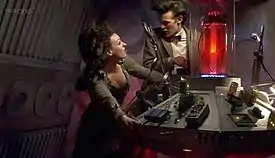 The Doctor refers to altering the control room's appearance as changing the desktop theme, as the Fifth Doctor does in "Time Crash".[2] Like the Third Doctor in Inferno (1970), the Doctor and Idris operate a TARDIS console without an outer TARDIS shell.[3] The Doctor also jettisons TARDIS rooms to create thrust, as he had done previously in stories such as Logopolis (1981) and Castrovalva (1982).[4] The Doctor admits he killed all of the Time Lords, alluding to the events of the Time War.[2] In The War Games (1969), the Second Doctor contacted the Time Lords using a cube similar to those seen in this episode.[5] The Doctor refers to himself as "a madman with a box", reprising Amy's and his own description of himself in "The Eleventh Hour".[3] The Doctor refers to Nephew as "another Ood I failed to save"; in "The Satan Pit" the Doctor commented that he did not have time to save the Ood.[2] Idris' cryptic words, "the only water in the forest is the river", are explained in the mid-series finale, "A Good Man Goes to War".[6]