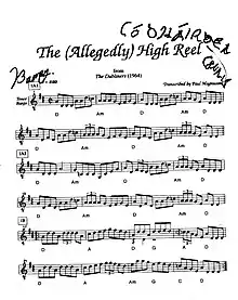 The tune labelled "The High Reel" is actually a medley of two different tunes. According to McKenna, the title of the first tune is "Códháirdeachais" (meaning "Congratulations" this an old, pre-1948, spelling of the Irish word; the current spelling would be "Comhghairdeas") and the title of the second is "The Boyne Hunt" (O'Neill 514, Willie Clancy 142). Several people have also noticed the resemblance of the first tune to the better-known "Sporting Nell".[2][3]