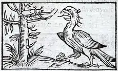Hieronymus Osius also dealt with the subject in Latin verse, drawing the same moral,[7] and also told the story at greater length in his Phryx Aesopus (1564).[8] In both cases the story is told of a dung-beetle (scarabaeus), as it was by La Fontaine in his Fables (L’Escarbot et l’aigle, II.8). In this the beetle is brought to trial by Zeus and convinces the god that it is in fact avenging the crime of lèse majesté. All Zeus can do is change the breeding time of the eagle to one when the beetle is hibernating.[9]
