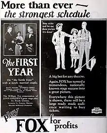 The First Year is a 1926 American silent comedy film directed by Frank Borzage and starring Matt Moore, Katherine Perry, John Patrick, Frank Currier, and Frank Cooley. It is based on the 1920 play of the same name by Frank Craven. The film was released by Fox Film Corporation on January 24, 1926.[1][2][3]