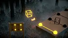 The game is puzzle game in which the player navigates three stages to complete puzzles, each based around reuniting one of the three band members. The player can float across stages and use Nina's voice to manipulate objects, press buttons, and collect items to activate objects.[1] In the first stage, the player assembles machinery by locating and assembling cables and manipulating valves and dials to power large generators.[2] In the second stage, the player activates light bulbs that illuminate the darkness of the forest.[3] In the final stage, the player transforms into a swarm of butterflies to navigate a series of pipes to direct the flow of water to put out forest fires.[2]