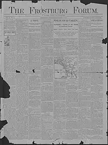 The Frostburg Forum was a weekly newspaper published in Frostburg, Maryland, U.S. from 1897 to 1901.[1] It was founded by John B. Williams and Henry Francis Cook, who had joined to form the Forum Publishing Co.[2] Cook had already began publication of another newspaper, The Frostburg News,[3] earlier that same year, and would subsequently go on to publish The Frostburg Gleaner in 1899.[4][5] The paper was initially edited by George T. Goshorn, a veteran newspaperman who had previously published newspapers in West Virginia in addition to working for the Government Printing Office in Washington, D.C.[6][7] By 1901, the Forum had been purchased by the Frostburg Home Building and Conveyance Company and was edited and published by its manager, N. Ralph Moore. The Forum ceased publication that same year, however, with Moore going on to edit the Linton Record.[8]