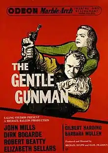 The Gentle Gunman is a 1952 British drama film directed by Basil Dearden and starring John Mills, Dirk Bogarde and Elizabeth Sellars. The film is based on a 1950 play of the same title by Roger MacDougall[1] that was televised by the BBC in September 1950.[2] It was produced by Ealing Studios. The film's sets were designed by the art director Jim Morahan.
