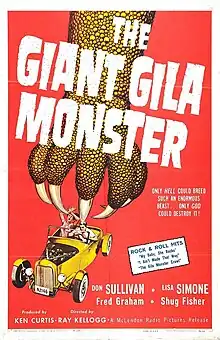 The Giant Gila Monster is an American 1959 science fiction horror film directed by Ray Kellogg and produced by Ken Curtis. This low-budget B-movie starred Don Sullivan, a veteran of several low budget monster and zombie films, and Lisa Simone, the French contestant for the 1957 Miss Universe, as well as comedic actor Shug Fisher and KLIF disc jockey Ken Knox. The effects included a live Mexican beaded lizard (not an actual Gila monster) filmed on a scaled-down model landscape.