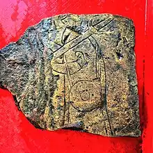 The stone differs from the other early medieval carved stones in the collection in that it is lightly incised. Although damaged, it depicts what appears to be a warrior, with a small, circular shield held over the shoulder of a side-on human figure via a strap. The person appears to be carrying a staff, spear or sword that is resting on the left shoulder. Much of the face is destroyed, but appears to show a sharply-pointed beard and a pony tail, with the latter aspect known from other stones in the existing collection.