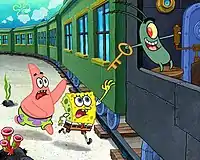 SpongeBob begins crying when Patrick reveals that he has found the key, which was in SpongeBob's pants. They board the train again, and Plankton steals the key and throws them out of a window. SpongeBob morphs himself into a hang glider and he and Patrick fly back onto the train to pursue him. Once they land, Plankton disconnects the coaches and tender of the train, leaving SpongeBob and Patrick in the engine. Patrick tries to stop it, but destroys the brakes and causes the engine to go faster. The Train Engine Was Out Of Control. Patrick stops the engine by throwing a boulder on the track, causing it to flip over and nearly collide with a retirement home. Next, Patrick accidentally breaks the throttle. Meanwhile, Plankton is seen trying to steal the formula but is stopped by Mr. Krabs. The engine crashes into the bank, and Mr. Krabs has to pay for the damages. 75 years later, SpongeBob, as an exaggeratedly elderly man, finishes telling the story to his grandson, who responds with a cheer in excitement over his video game then SpongeBob responds by saying "kids today" before going off to sleep.[2]
